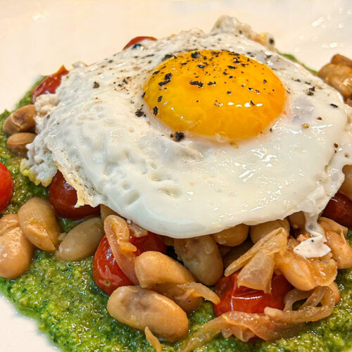 Fry some grape tomatoes, onions and garlic in a pan until the tomatoes burst. Add in a can of rinsed cannellini beans until heated through. Mix in your arugula sauce and plate. Top with a poached or fried egg and sprinkle Asiago cheese. We often pre-make the tomato and onion mixture and reheat it in the microwave, then top with a freshly cooked egg for a quick morning meal. Roasted Vegetables: